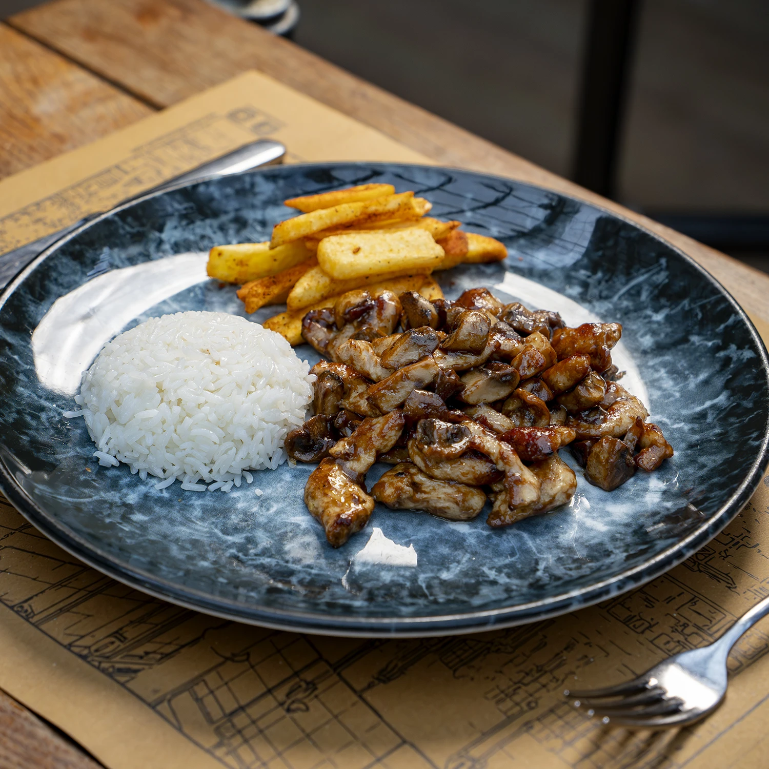 Piliç Fileto, Mantar, Barbekü Sosu, Pirinç Pilavı ve Küp Patates İle.