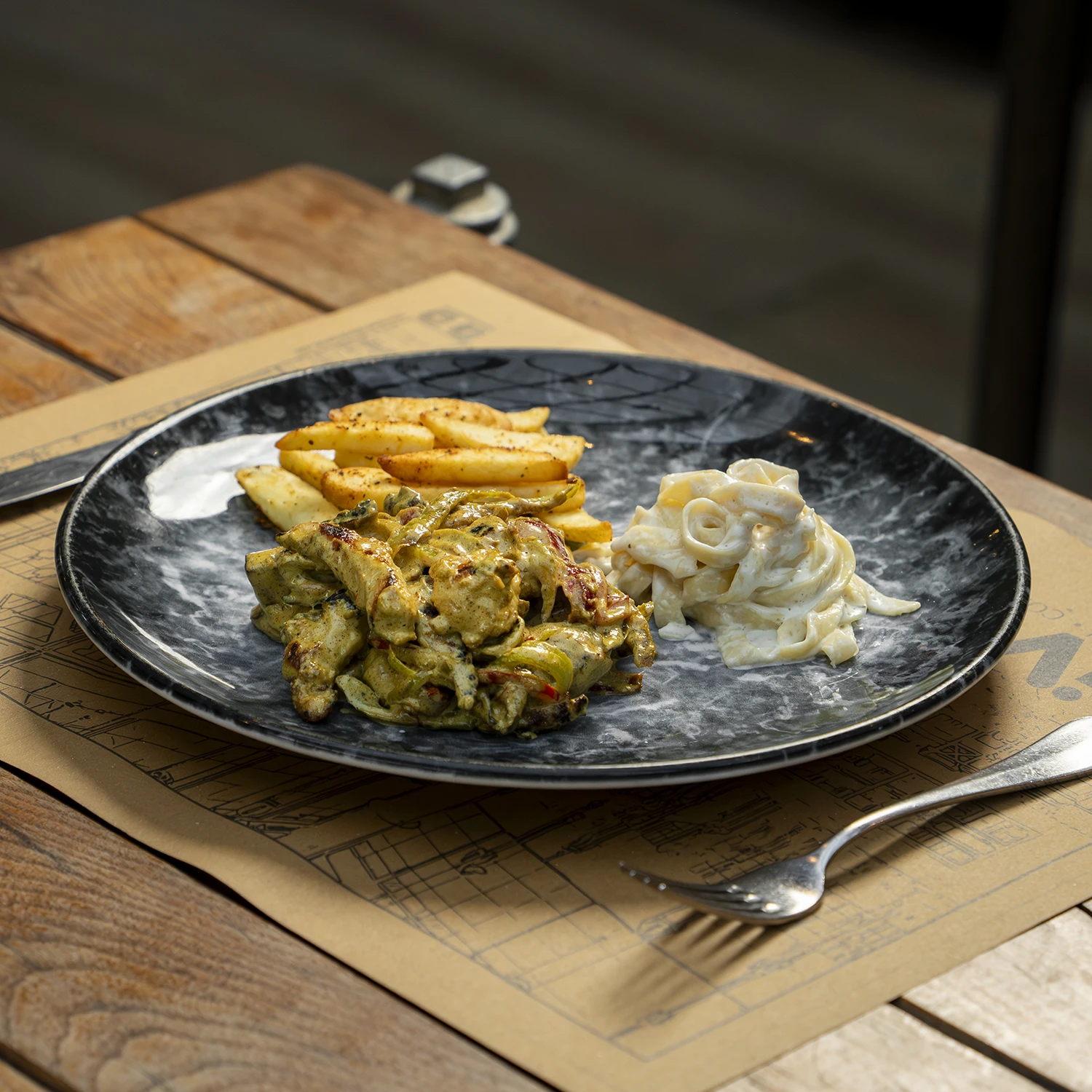 Piliç Fileto, Kapya Biber, Çarliston Biber, Mantar, Köri, Kremalı Makarna ve Tereyağlı Patates İle.