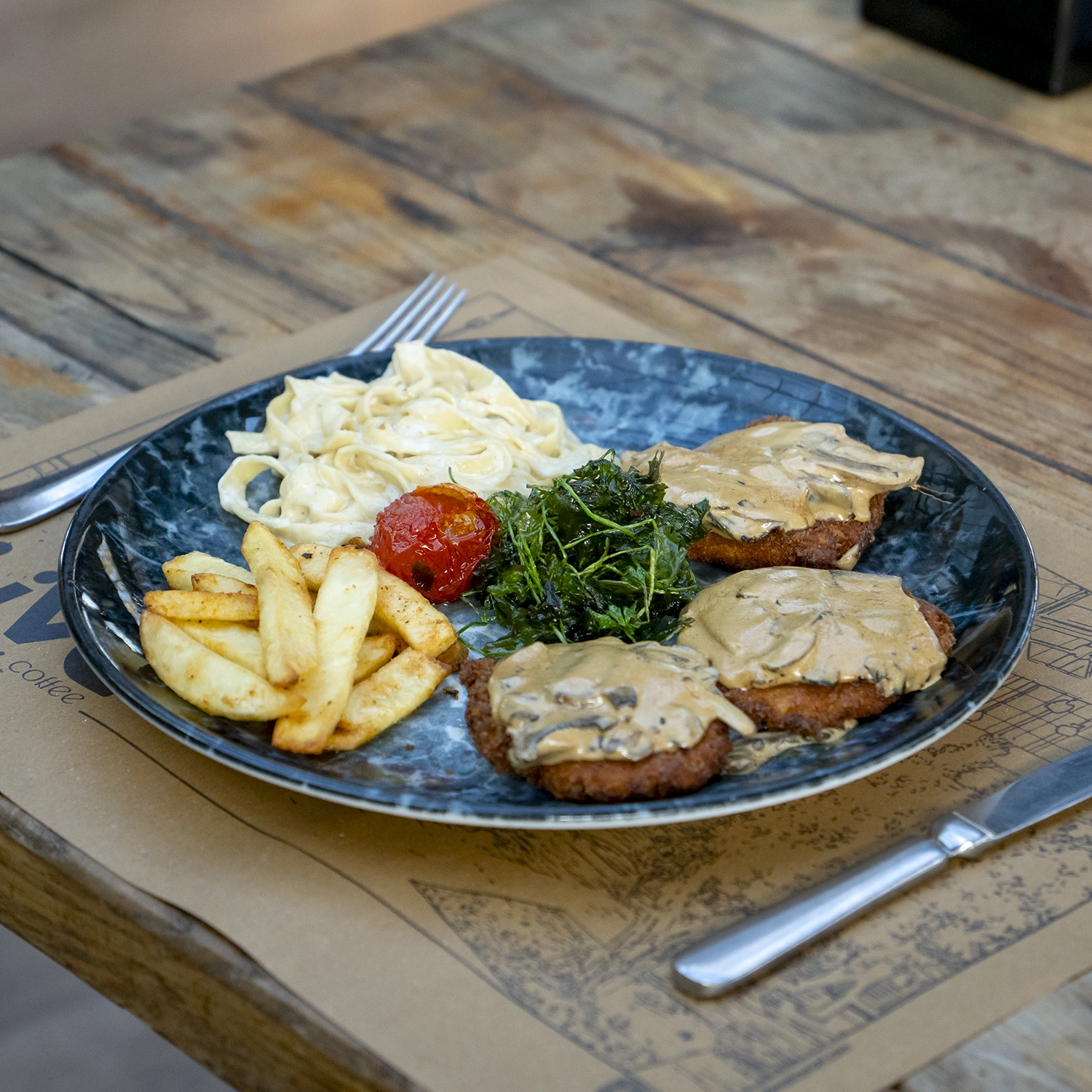 Panelenmiş tavuk fleto, mantar sos, kremalı makarna ve tereyağlı patates ile