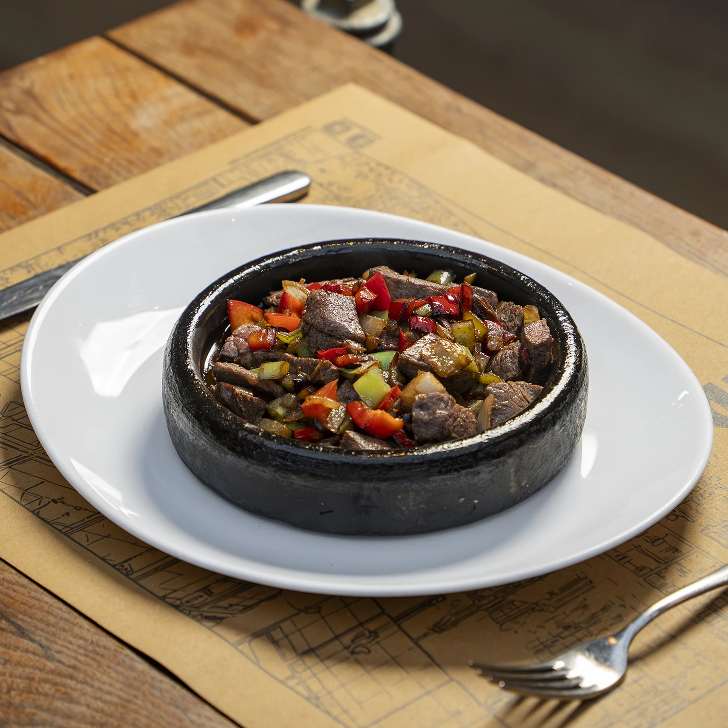 Güveçte pişirilmiş dana eti, domates, biber, soğan ve kaşar peynir eşliğinde…
